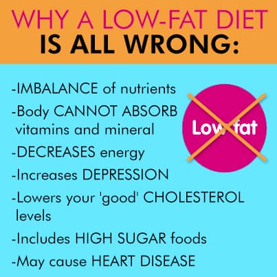 Why A Low-Fat Diet Is All Wrong: -Imbalance of nutrients -Body cannot absorb vitamins and mineral -Decreases energy -Increases depression -Lowers your ‘good’ cholesterol levels -Includes high sugar foods -May cause heart disease